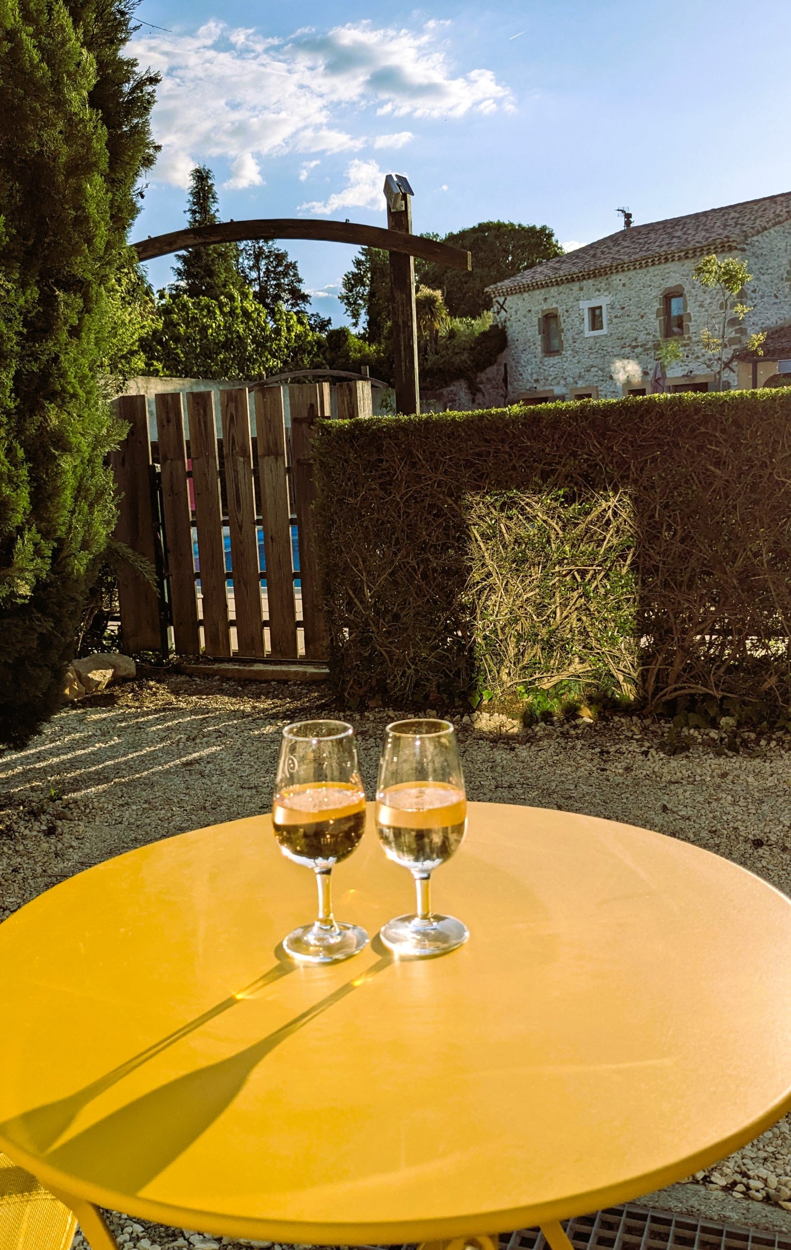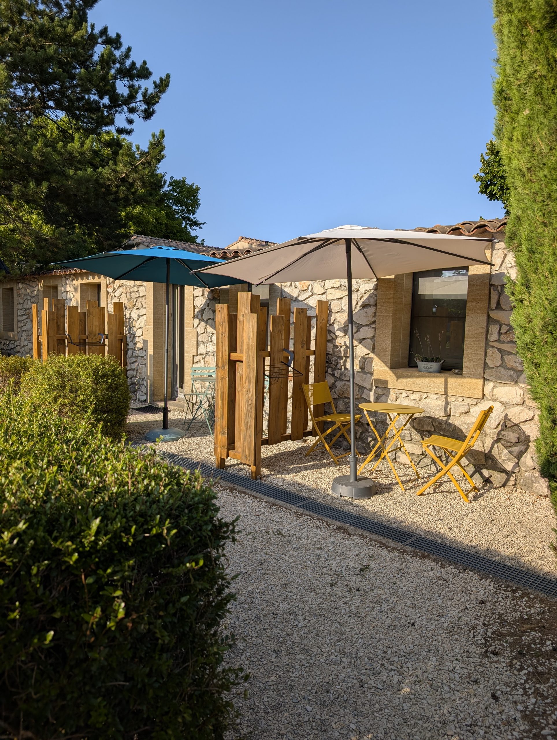 • Terrasse privative avec table et chaises de jardin à l’ombre du grand pin